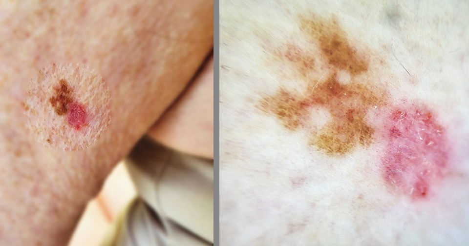 В ирландскую клинику пластической хирургии обратилась 80-летняя женщина с образованием на коже задней поверхности плеча левой руки. При осмотре наблюдалось коричневое образование с неровными краями, примыкающее к розовому образованию с ровными краями и поверхностным шелушением. При дерматоскопии первое образование имело равномерную коричневую окраску с эксцентричными гиперпигментированными асимметричными включениями, которые соответствовали неравномерно распределенным скоплениям меланоцитов вдоль соединения дермы и эпидермиса. Второе образование отличалось телеангиоэктазией (сосудистыми звездочками) и множественными мелкими эрозиями. Мария Мерфи (Maria Murphy) из Ирландского королевского хирургического колледжа и Берни Финнеран (Bernie Finneran) из Роскоммонской университетской больницы поделились этим случаем в The New England Journal of Medicine.