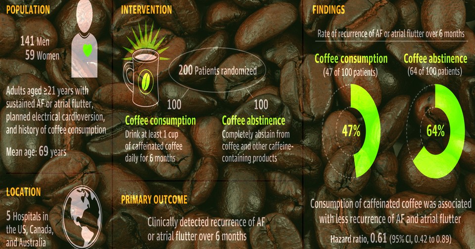 Кристофер Вон (Christopher Wong) из Калифорнийского университета в Сан-Франциско с коллегами провел проспективные открытые рандомизированные испытания DECAF в пяти клинических центрах трех стран. В них приняли участие 200 пациентов (средний возраст 69 лет, 71 процент — мужчины) с постоянной фибрилляцией предсердий или трепетанием предсердий с фибрилляцией в анамнезе, которым назначили плановую электрическую кардиоверсию. Все они на момент включения или в течение пяти лет до него регулярно употребляли кофе в среднем по семь чашек в неделю. После уcпешной кардиоверсии 100 участникам случайным образом рекомендовали ежедневно выпивать как минимум чашку не декофеинизированного кофе, остальным 100 — воздерживаться от употребления кофе и кофеиносодержащих продуктов.