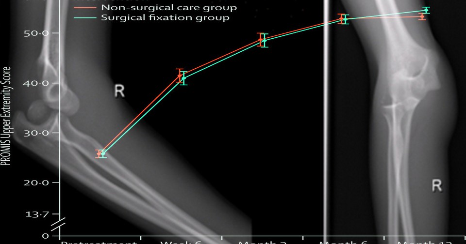 Первичной конечной точкой испытаний служило функциональное состояние верхней конечности через 12 месяцев по педиатрической шкале PROMIS, данные были получены от 85 процентов участников. Различие средних значений этого показателя после консервативного и хирургического лечения оказались незначимым: 53,1 против 54,3 балла, средняя разница 1,57 балла (p = 0,052). Дополнительные операции, плановые или в связи с осложнениями, потребовались 24 детям после хирургического лечения и трем после консервативного.