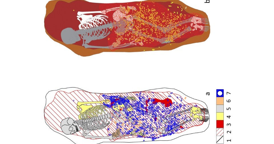 В общей сложности в могиле и в грунте, выкопанном из нее в древности, археологи обнаружили 99 проколотых зубов благородных оленей, 1462 проколотых раковины улиток C. neritea и несколько остатков других морских моллюсков, а также, возможно, два комка охры. Вместе с этим крайне богатым набором украшений древние люди похоронили ребенка, которому на момент смерти было около 11–12 лет (в публикации 2010 года эти останки приписаны взрослому человеку). Чтобы определить его пол, ученые проанализировали белки в зубной эмали и обнаружили только одну изоформу амелогенина — AmelX, что указало на женский пол.