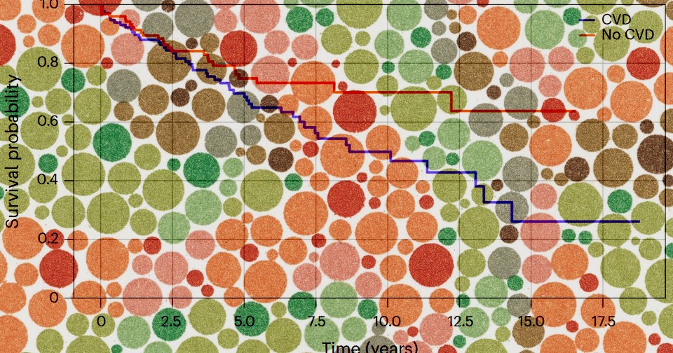 Анализ с помощью логрангового критерия показал, что при наличии расстройства цветового зрения вероятность выживания при раке мочевого пузыря ниже, чем при его отсутствии (χ2 = 4,85; p = 0,028). Моделирование 20-летней выживаемости показало, что при расстройствах цветового зрения она на 52 процента ниже, чем при их отсутствии (относительный риск 1,52; p = 0,025). Аналогичное исследование расстройств цветового зрения при раке толстой и прямой кишки с когортами по 187 человек подобных закономерностей не выявило.