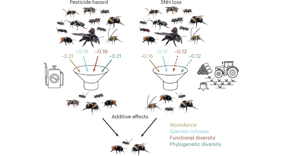 Количественный анализ подтвердил, что полуприродные территории увеличивает численность пчел на 0,16 стандартного отклонения и их видовое богатство на 0,12 стандартного отклонения в пределах всего ландшафта. При этом положительных эффектов от таких буферных зон не хватает, чтобы компенсировать негативные эффекты применения пестицидов. Обработка полей пестицидами снижала численность пчел и их разнообразие — видовое, филогенетическое и функциональное — даже в присутствии обширных полуприродных зон.