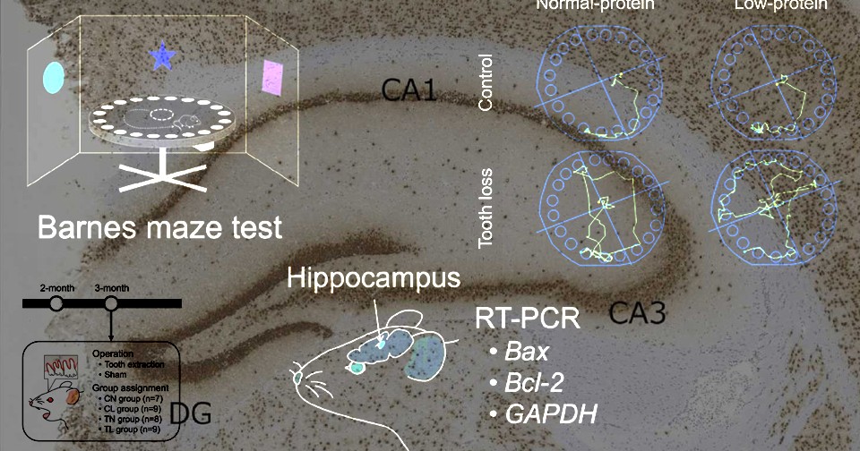 Исследовательская команда под руководством Хироси Оуэ (Hiroshi Oue) из Университета Хиросимы изучала, как низкобелковая диета влияет на снижение когнитивных функций после потери зубов у мышиной модели ускоренного старения. Всего изучалось четыре группы мышей: семь мышей в контрольной группе с нормальной диетой, девять мышей в контрольной группе с низкобелковой диетой, восемь мышей без зубов с нормальной диетой и девять мышей без зубов с низкобелковой диетой. В двух последних группах моляры верхней челюсти с двух сторон мышам удалили в возрасте трех месяцев.