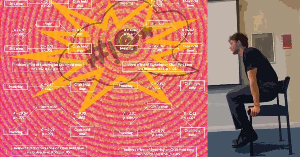 Ричард Стивенс (Richard Stephens) из Килского университета с коллегами пригласил для участия в двух экспериментах людей в возрасте от 18 до 65 лет без травм, нарушений здоровья и боли, ограничивающих максимальную физическую производительность. В первом эксперименте приняли участие 88 человек (средний возраст 26,4 года, 54 женщины). Им предложили сесть на стул, положив на него ладони, после чего оторвать от пола стопы и распрямить руки, удерживая на них вес тела максимально долго. Это упражнение повторяли множество раз, регистрируя результаты. Случайным образом в определенный момент выполнения участникам предлагали раз в две секунды повторять либо заранее выбранное ими ругательство (которое они могли бы произнести при ударе головой), либо нейтральное слово (которое они могли бы употребить при описании стола).