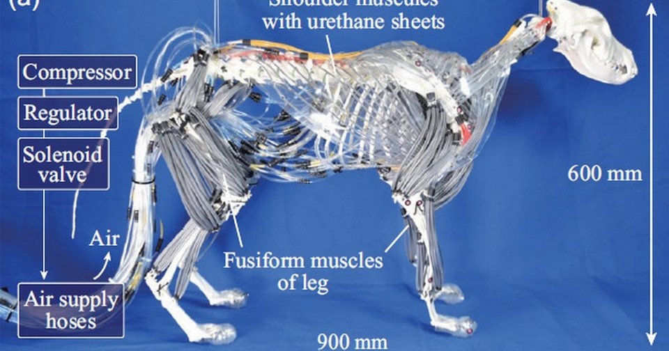 Японские инженеры создали четвероногого робота, который анатомически точно воспроизводит строение тела собаки. Вместо электромоторов в нем используются гибкие пневматические искусственные мышцы Маккиббена, которые позволяют имитировать естественные движения животного. Особое внимание разработчики уделили воспроизведению мышечной структуры плечевого пояса собак, у которых лопатки крепятся к туловищу только за счет мышечной ткани, без суставов. Прототип успешно продемонстрировал стабильную ходьбу по прямой. Статья опубликована в журнале Advanced Robotics Research.