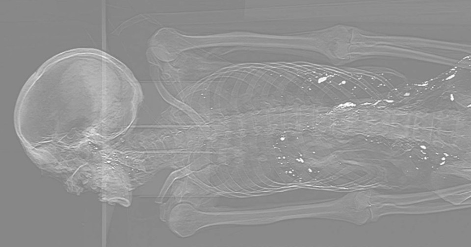 Кроме того, исследователи выяснили некоторые особенности подготовки этого тела к погребению. В кишечнике и туловище ученые заметили большое количество ртути. В кишечнике не было остатков пищи или фекалий, зато там находилась красноватая субстанция, которая оказалась остатками раствора, сделанного из киновари — ртутьсодержащего минерала. По всей видимости, консервирующий раствор вводили внутрь тела покойного через искусственно расширенное анальное отверстие с помощью клизмы. Со временем пары ртути проникли из кишечника и в брюшную полость.